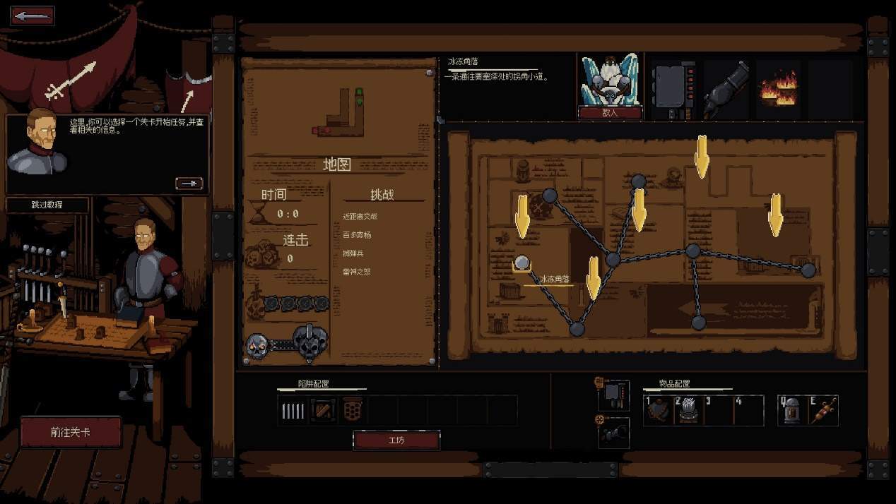 游戏采取了关卡的设计来调配资源的产出,不同关卡提供一些不同的机制和地图结构,在进入地图前会被表示。每次进入地图也会标注每个地图的独特挑战任务,也提供额外的挑战任务。通过探索和任务,玩家可以收集资源用来解锁各种强化。
