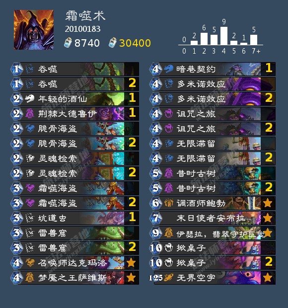 但是实测下来,融合怪多头蛇萨鲁法尔等复制只能复制他们自己,靠战吼无限是不可能了。 但是天无绝人之路,不知道是bug还是机制,如果你的随从本身具有亡语,那么你后来对这个随从附加的所有亡语,在它死后都会被计入安布拉的战吼里。 那么有啥合适的附加呢?答案是术士的诅咒之旅(给随从附加亡语,召唤俩休眠两回合的复制) 而说到这个,第一反应就是龟术,于是我在龟术的基础上,调配出了这套地沟油 而其中的亡语,我选择了霜噬海盗(322,亡语冻三个,如果已经冻了造成五点伤害) 围绕着这张卡,有如下几种配合:1.脆骨海盗贴复生2.诅咒之旅亡语召唤休眠3.荆棘大德鲁伊获得亡语4.无限滞留复生5.死骑游客亡语触发两次(不推荐) 以上几种可以搭配使用,而诅咒之旅该给古树也别省,龟住最重要然后终结手段为死骑游客配合安布拉(这也是我为什么带伊瑟拉)该配合斩杀线为5*9=45(第一次冰冻无伤害)如果对面龟住了也没关系,如果之前贴过诅咒之旅,那你应该会同时产生四个休眠,待到休眠结束,就可以用无限滞留+空宇再来一波5*7=35,而极限情况下,更是可以打出无限滞留,无限滞留,多米诺(解自己),荆棘大德鲁伊,空宇,的斩杀,达到5*23(两次无限滞留8+多米诺4+大德鲁伊12-首次冰冻1)=115点斩杀对于击碎大部分龟壳来说也是够用的了