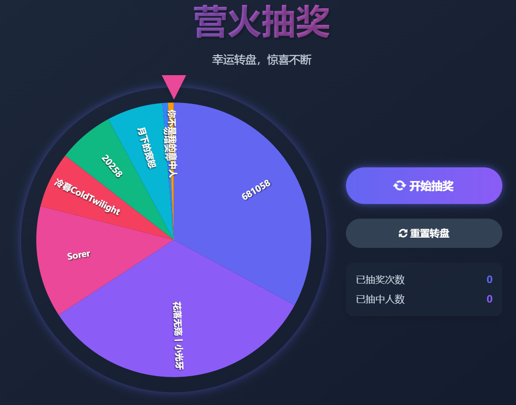举例说明:张三打赏了500营火,李四和其他人打赏100营火,那么转盘如下,等于打赏多会增加你中奖的机会,但是并不能保证一定会中。