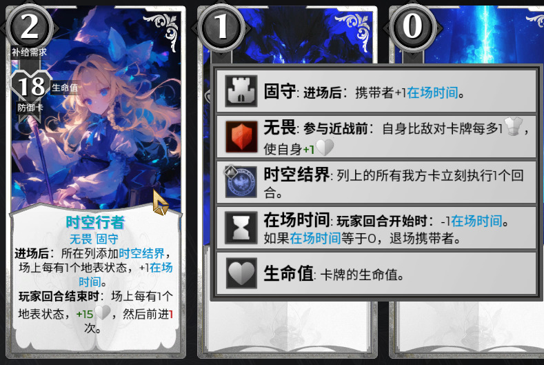 “琼华”不必多说,本身就是石隐体系中常见的一张卡,“鼓舞歌者” 需要另外找一个高攻击频率的队友,“玄瑶”则最好搭配“摧毁”类卡牌或者“时间行者”等卡牌提供的场地效果腾格子,否则会出现格子不够的情况。最后的“冰焰”则是事件特殊卡牌,如果能碰到是再好不过了,相当于大半个不会退场的“琼华”而且每回合还给费用。