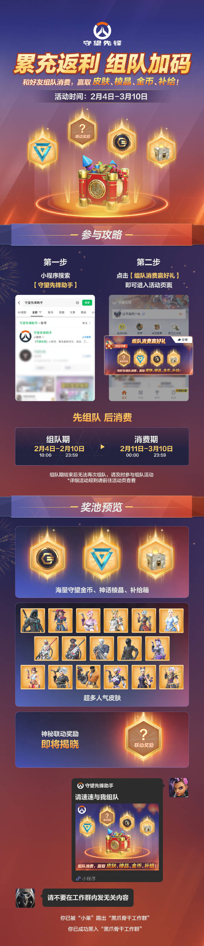 2月4日至3月10日期间,先组队,后消费,返利福利人人共享!奖池包含海量守望金币、神话棱晶、补给箱,更有超多人气皮肤和神秘联动奖励,组队环节2月10日晚截止,快去寻找你的队友吧!