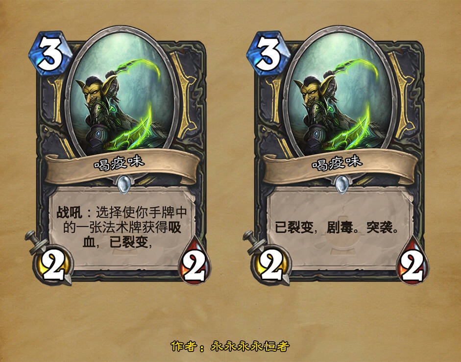 喝疫味在裂变前,能给予一张法术“吸血,裂变,剧毒”。突袭是其自带的效果。被其影响的法术裂变后,会创建一张仅具有剧毒,什么都不做的法术,此法术会在裂变时分走原法术一半的消耗。