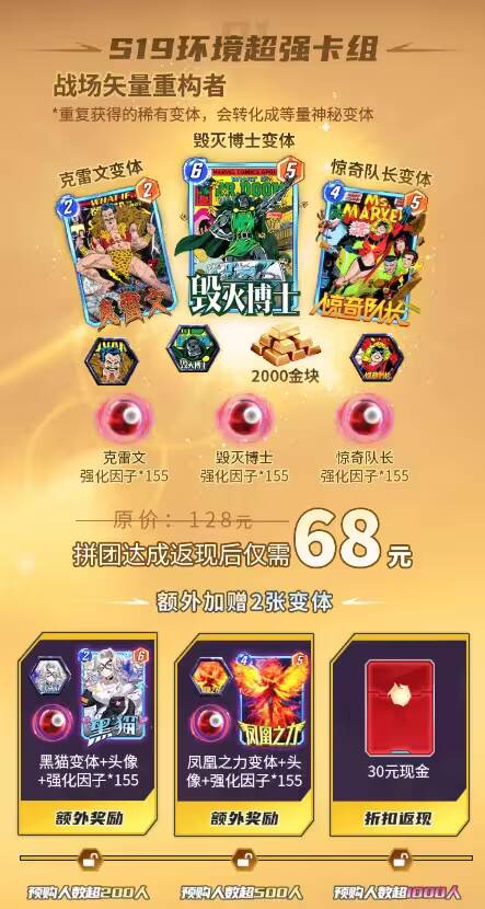 活动时间截至2月4日23:59分 拼团成功立减30元,到手仅需68元即可获得: 5张变体+5个头像+2000金块+775强化因子