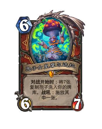- 新:对战开始时:将7张复制孢子洗入你的牌库。战吼:施放其中一张。