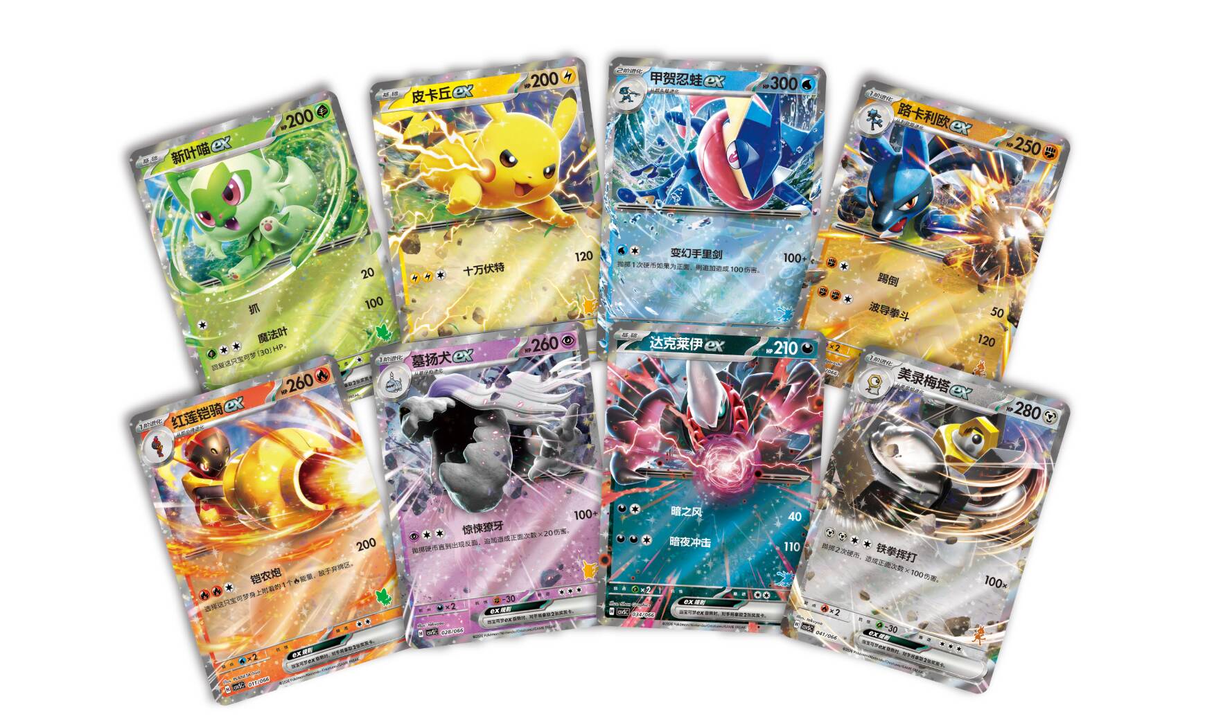 对战学院中封入了4套全新卡组,分别是新叶喵ex卡组、皮卡丘ex卡组、甲贺忍蛙ex卡组以及路卡利欧ex卡组。卡组中共收录了8张宝可梦ex闪卡。