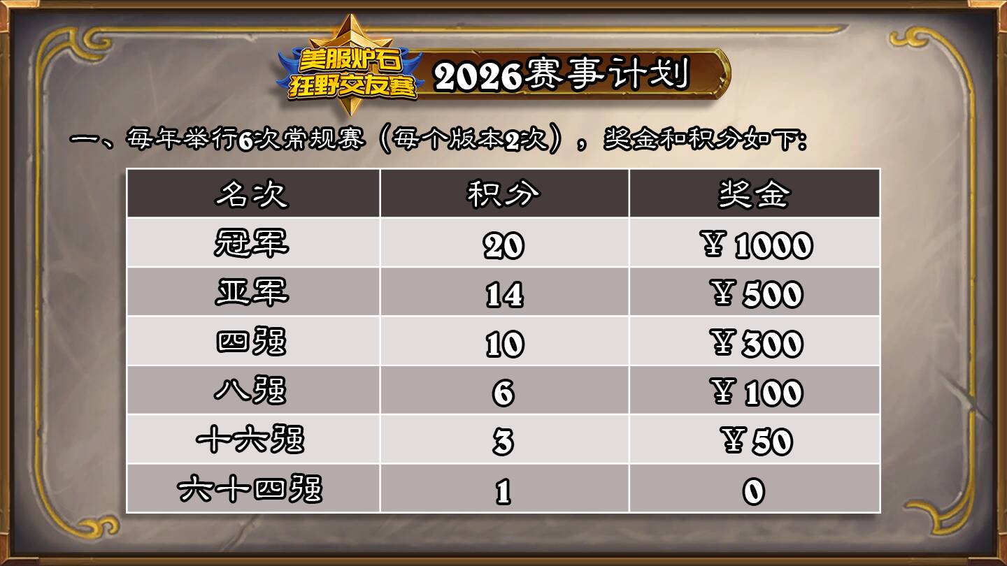 甲虫年美服炉石狂野交友赛”将分为6届常规赛(每个版本两次)和1届年终总决赛,参与常规赛将会获得赛事积分,积分将是参与年终总决赛的凭证之一。